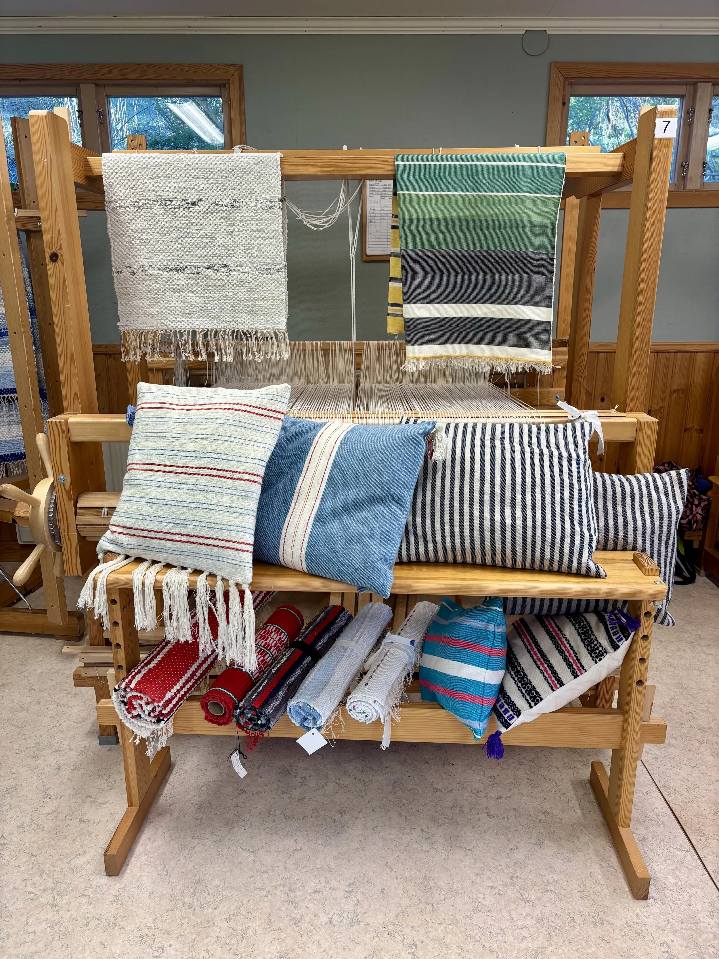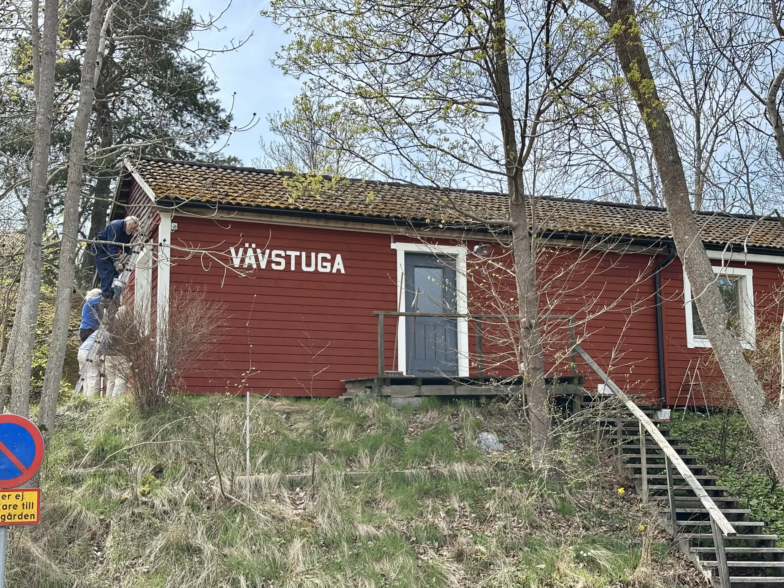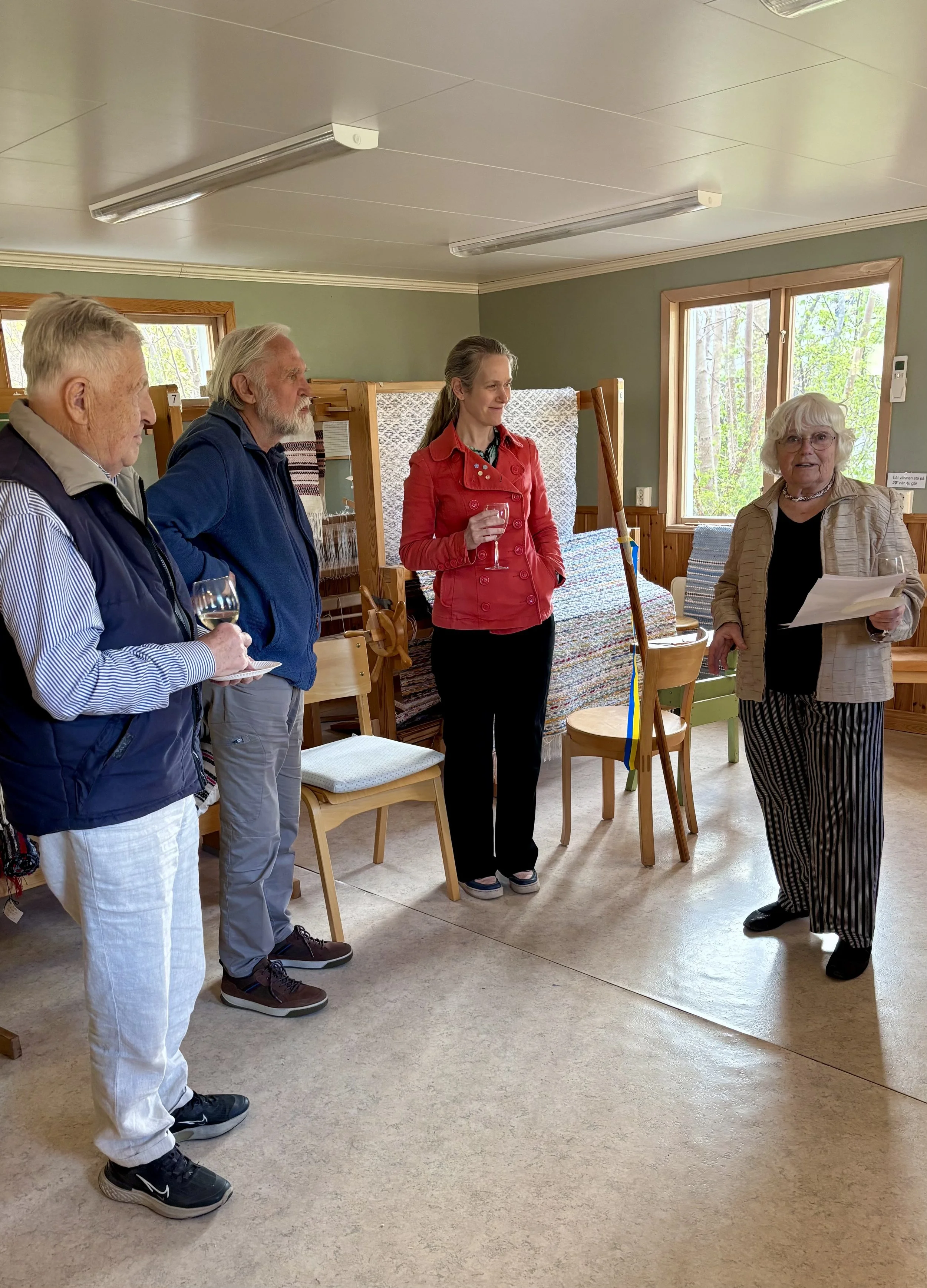 Vävstugans återinvigning 29 april 2025 blev otroligt trevlig med stor uppslutning bl.a. av tre lokalpolitiker plus Jors Damberg som var med och byggde vävstugan på 80-talet och som på senare år även bidragit med vår fina skylt. Vi var runt 25 personer som klämde in oss bland vävstolarna och beundrade de fantastiska alstren och njöt av god samvaro och gott tilltugg. Nu är vävstugan tilläggsisolerad, har sänkt innertak och är nymålad inne och ute. Vävstolarna är tillbakaflyttade och vävstugan kan användas igen, året runt, med denna energibesparande makeover.